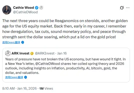 ARK Invest founder Cathie Wood (aka "Wood Sister") released a macro outlook in her latest 2026 New Year Investor Letter, likening the next three years to "Reaganomics on steroids." She pointed out that with deregulation, tax cuts, sound monetary policy, and the integration of innovative technologies, the US stock market will usher in another "golden age," and the upcoming surge in the US dollar may put an end to the upward momentum of the gold price.