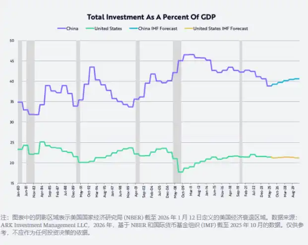 The productivity gains could also help correct significant geopolitical economic imbalances in the global economy. Businesses can channel the benefits of productivity enhancement into one or more of the following four strategic directions: expanding profit margins, increasing R&D and other investments, raising wages, and/or lowering prices. In China, raising wages for higher productivity workers and/or increasing profit margins can help the economy overcome structural issues of overinvestment. Since joining the World Trade Organization (WTO) in 2001, China's investment as a percentage of GDP has averaged around 40%, nearly double that of the U.S., as shown in the chart below. Increasing wages will drive the Chinese economy towards a consumption-oriented transformation, moving away from the path of commodification.