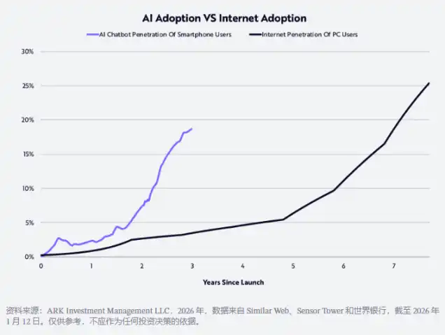 In addition to semiconductor and publicly listed large cloud companies, pre-IPO AI-native enterprises are also benefiting from growth and return on investment. AI companies are among the fastest-growing companies in history. Our research indicates that consumer adoption of AI is happening at twice the pace of internet adoption in the 1990s, as shown below.