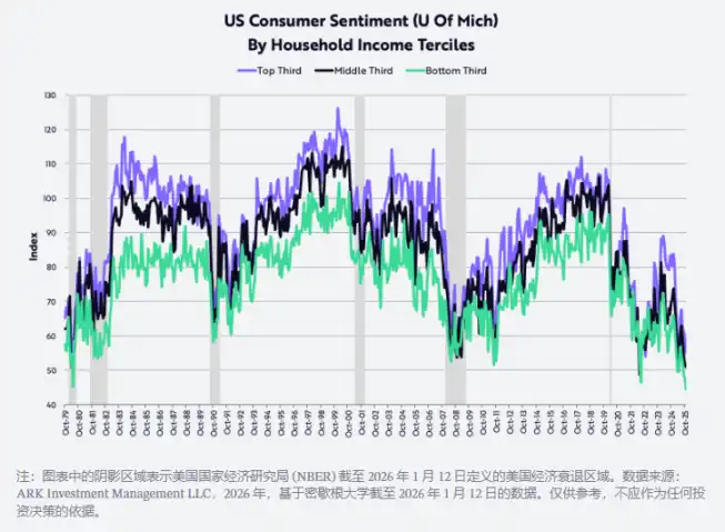 Meanwhile, data from the University of Michigan shows that confidence among the middle- and low-income groups has dropped to the lowest level since the early 1980s. Back then, double-digit inflation and high interest rates severely eroded purchasing power, pushing the U.S. economy into a prolonged recession. Additionally, as shown in the chart below, confidence among high-income individuals has also declined in recent months. In our view, consumer confidence is currently one of the most tightly compressed and rebound-ready "springs."