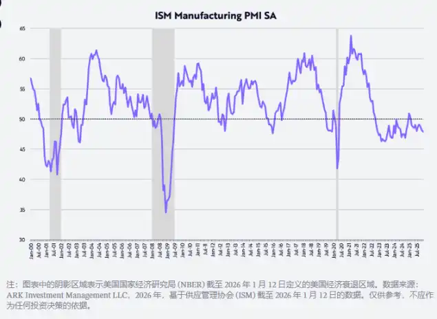 Measured by the U.S. Purchasing Managers' Index (PMI), the manufacturing sector has been in a contraction phase for about three years. According to this diffusion index, 50 is the threshold between expansion and contraction, as shown in the chart below.