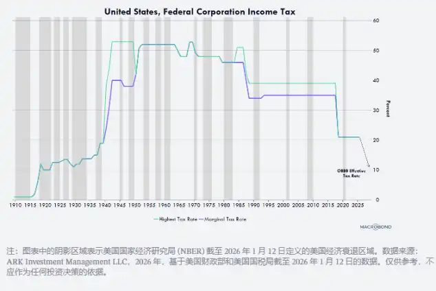 Regulatory relaxation is unleashing innovation across various sectors, led by the first "AI and Crypto Czar" David Sacks. Meanwhile, reductions in tips, overtime pay, and social security taxes will provide a significant tax refund to U.S. consumers this quarter, potentially driving the annualized growth rate of real disposable income from around 2% in the second half of 2025 to around 8.3% this quarter. Furthermore, as manufacturing facilities, equipment, software, and domestic R&D expenses enjoy accelerated depreciation, the effective tax rate for businesses will be reduced to near 10% (as shown in the chart below), with an expected substantial increase in corporate tax refunds, and 10% is one of the lowest tax rates globally.