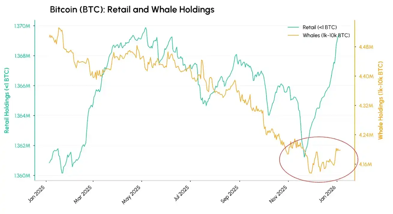 On-chain data shows that since the beginning of January, the token sell-off behavior of whale wallets holding 1,000-10,000 Bitcoins has noticeably tapered off, indicating a weakening selling pressure from this group. At the same time, retail investors holding less than 1 Bitcoin have been rapidly accumulating since mid-November last year. As cryptocurrency prices retreat from their highs and consolidate, retail investors are strategically positioning themselves at lower levels. The reduction in whale sell-offs combined with continued retail buying has collectively formed a favorable market scenario.