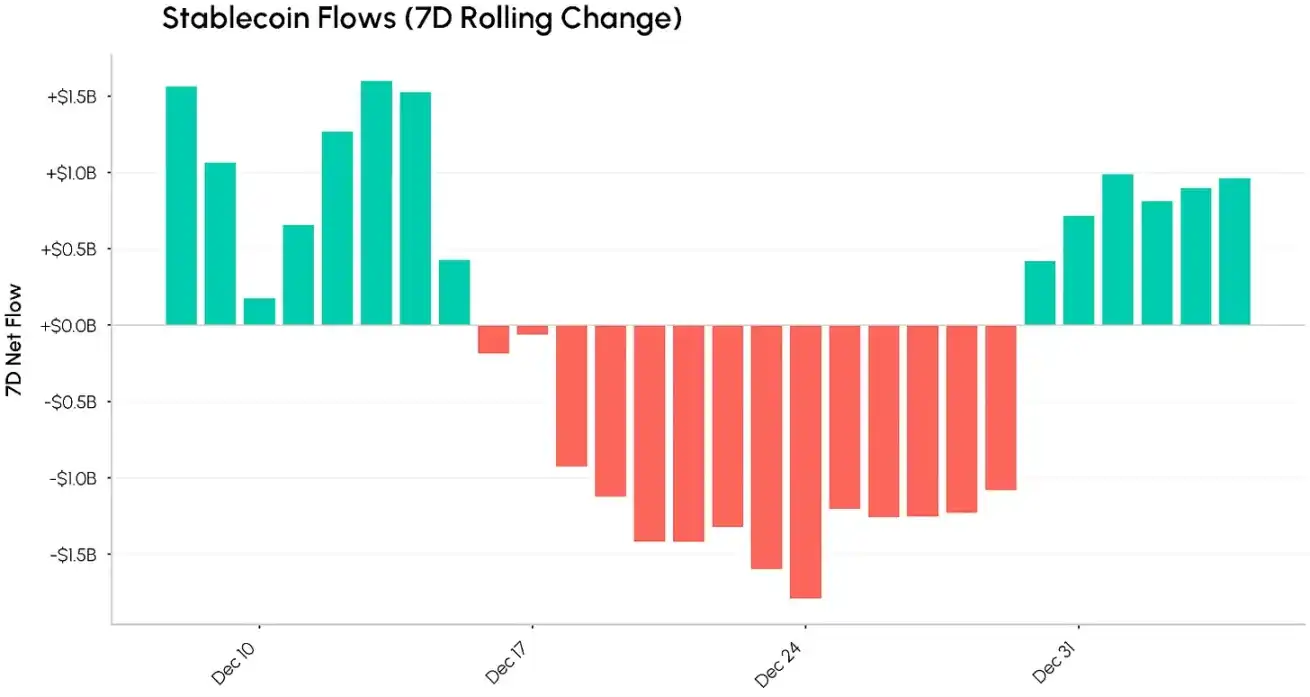 The flow of funds in stablecoins is a key indicator for monitoring capital flows in the crypto market. In early December last year, the stablecoin market consistently saw net inflows, but towards the end of the year, the flow reversed from positive to negative, with a net outflow of over $1 billion in a single week. As we entered January 2026, stablecoin fund flows stabilized and turned back to net inflows. If this trend can continue, it will provide strong support for the ongoing rise in the crypto market.