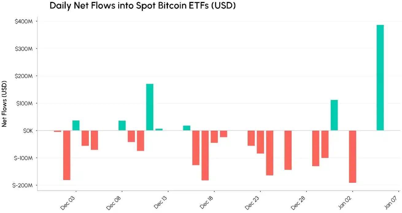 A spot Bitcoin ETF reversed the trend of fund outflows at the end of the year, with a net inflow of over $350 million on January 5, signaling institutional funds flowing back into the crypto market. In the days around New Year's Day, the spot Bitcoin ETF saw a net outflow of over $320 million. This trend reversal indicates that as the first quarter of 2026 begins, institutional investors' allocation interest is picking up.