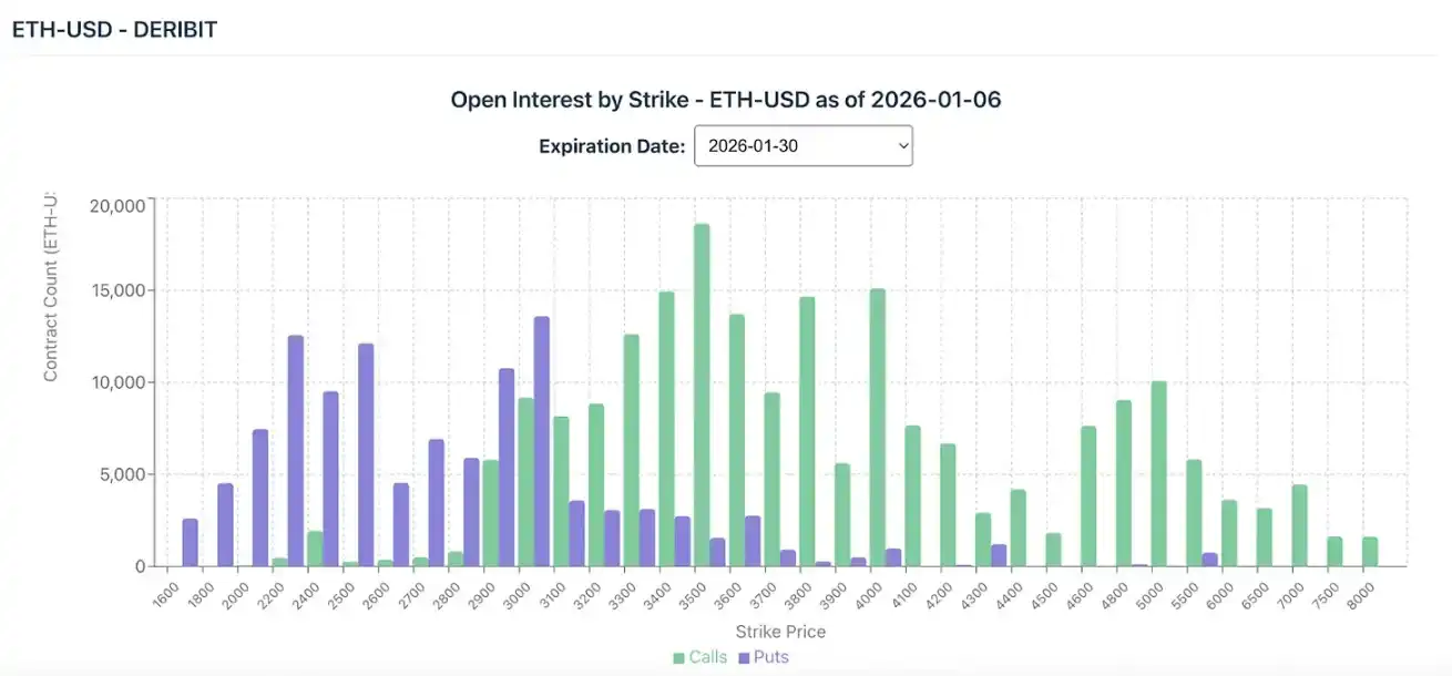 Derivatives market positioning indicates a cautious bullish outlook for the first quarter of 2026. The following two charts display the open interest of Bitcoin and Ethereum options contracts on the Deribit platform expiring on January 30, 2026, aggregated by strike price, providing a visual representation of options traders' bets on the short-term market direction.