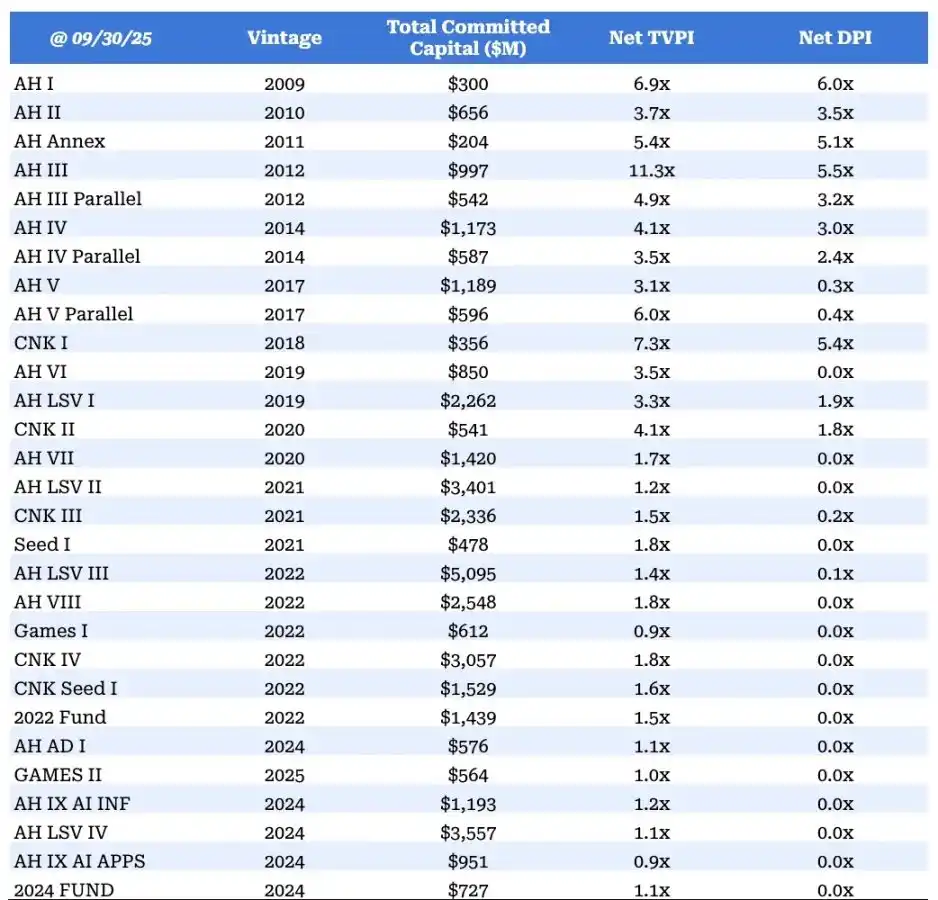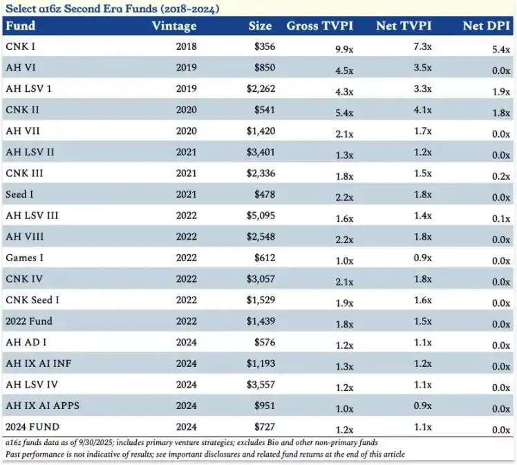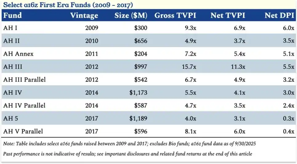 Of course, a16z raised funds and needs to create returns for investors. It has to excel in this regard, and so far, its performance has been outstanding. Not Boring has obtained the return data for a16z's funds to date, which we will share in the following text.