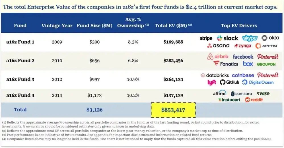 Previously mentioned, peers once questioned whether the combined valuation of a16z's first four funds need to reach $240-480 billion for validation. In fact, the combined valuation of a16z's Funds I-IV (based on exit or latest post-money valuations) has already reached $853 billion [7].