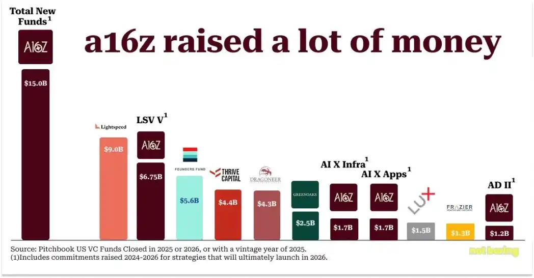 [3] According to Pitchbook data, the total venture capital fundraising in the U.S. in 2025 was $82 billion, with a16z contributing $15 billion.