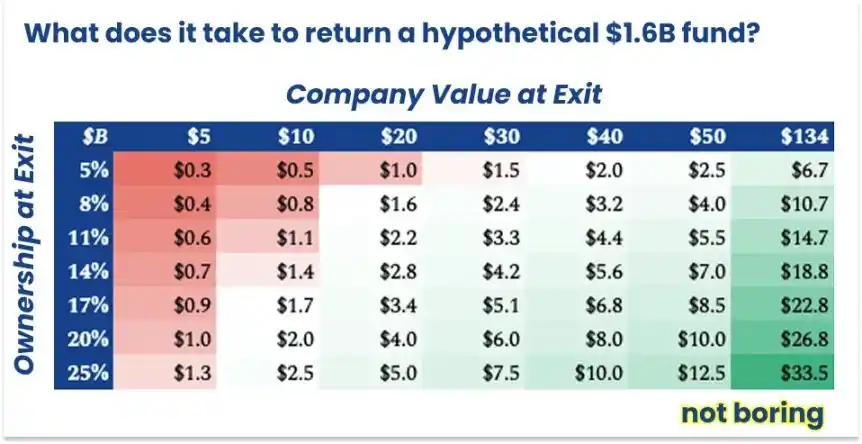 For example, in 2015, New Yorker journalist Tad Friend, in writing The Future Shaper, had breakfast with Marc Andreessen (co-founder and general partner at a16z). Prior to this, Friend had just heard skepticism from a peer VC that the a16z fund was too large in size but too low in ownership [1], needing the total returns of the first four funds to be 5-10x, with the total portfolio valuation reaching $240-480 billion.