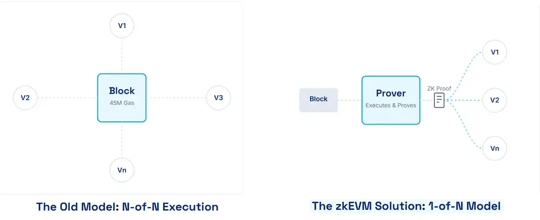 · 1 of N New Paradigm: A few provers execute the entire block and produce a short proof; the entire network only performs constant-time verification. The cost of verification is much lower than re-execution, enabling a safe increase in L1 gas limit and reducing hardware requirements.