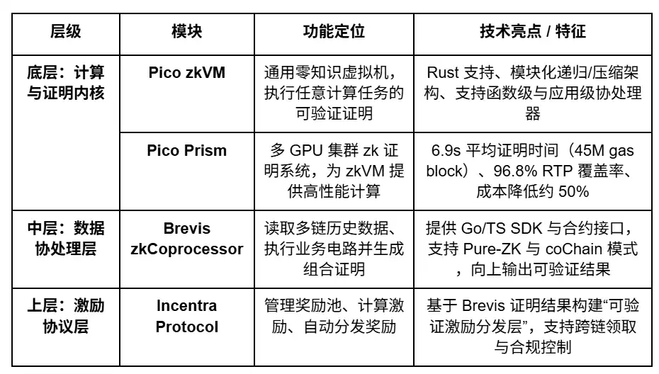 Brevis builds a multi-chain trusted computing layer with "General zkVM (Pico/Prism)" and "Data Coprocessor (zkCoprocessor)": the former addresses verifiable computation problems of any nature, while the latter drives business implementations of historical and cross-chain data.