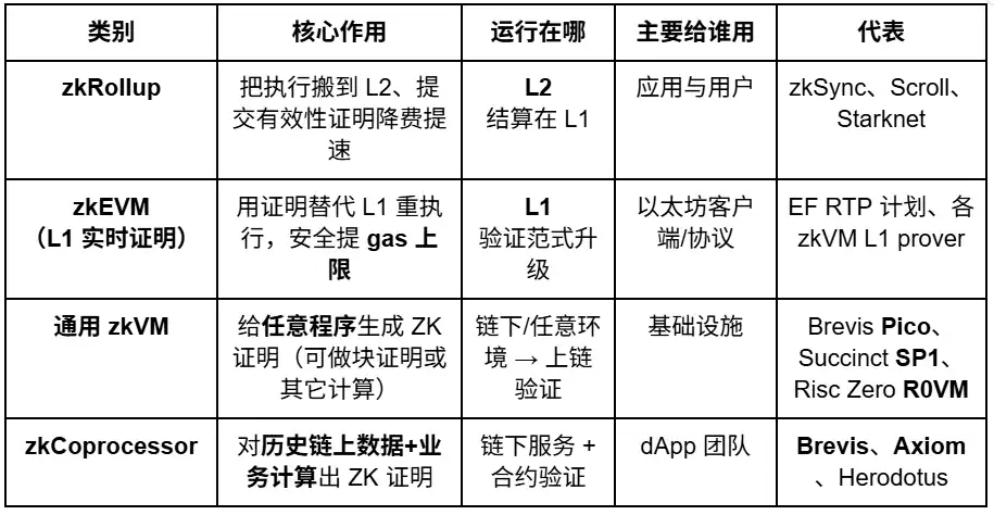· Performance-oriented: Brevis Pico, SP1, Jolt, ZisK focus on low latency and real-time proof, improving computation throughput through recursive STARK and GPU acceleration.