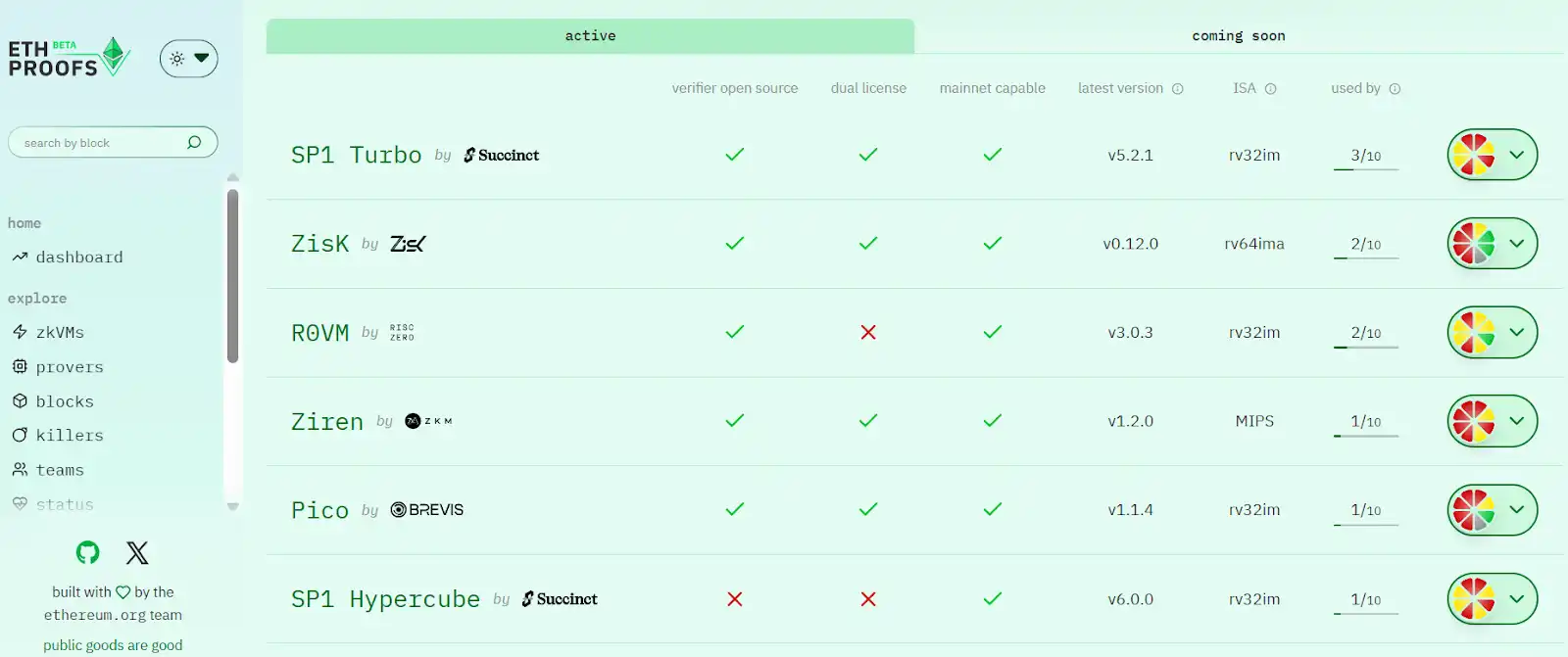 Currently, ETHProofs.org, supported by the Ethereum Foundation, has become the core tracking platform for L1 zkEVM Realtime Proving (RTP) route, used to publicly demonstrate each zkVM's performance, security, and mainnet adaptation progress.