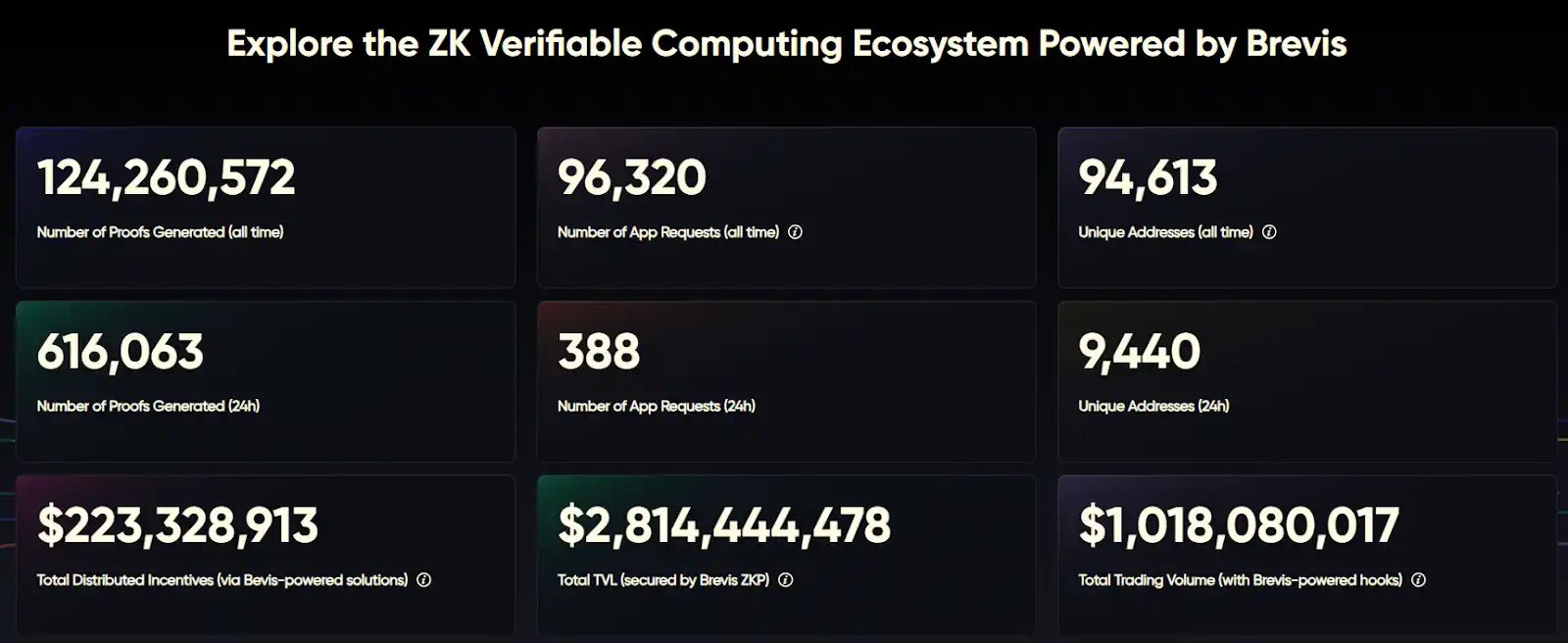 According to Brevis Explorer data, as of October 2025, the Brevis Network has cumulatively generated over 125 million ZK proofs, covering almost 95,000 addresses, and 96,000 application requests, extensively serving scenarios such as reward distribution, transaction verification, and staking proof. On the ecosystem level, the platform has distributed approximately 223 million USD in incentives, supporting a TVL exceeding 2.8 billion USD, with a cumulative transaction volume surpassing 1 billion USD.