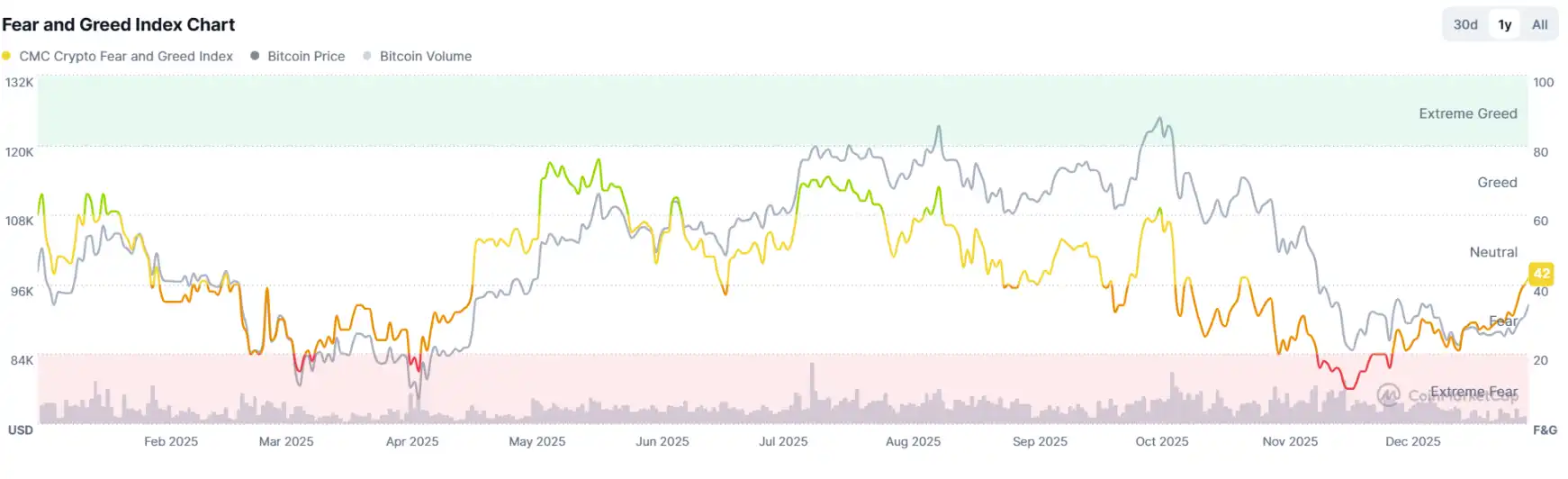 After more than 3 months of low readings, the Fear and Greed Index today rarely rose to 42, returning to neutral sentiment in the market.