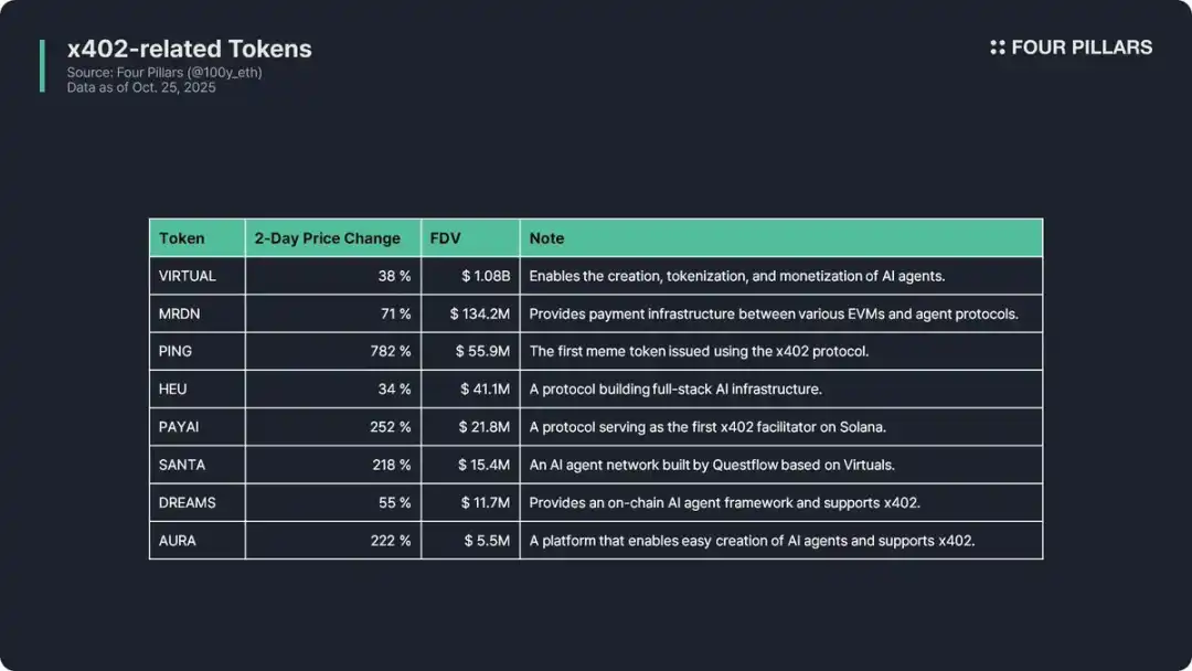 A direct signal of x402 entering the hype phase is the sharp increase in the prices of related tokens. For example, the token $VIRTUAL, which experiences a price surge whenever the concept of "AI Smart Agents" heats up, surged by 40% in just two days. Other related tokens also saw significant increases, as shown in the chart below.