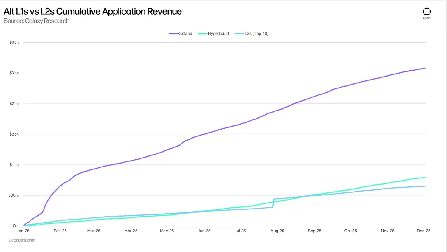 Outcome: This prediction did not materialize. On both network and application layers, Layer 2 performed below major Alt-L1 chains. Solana solidified its position as the de facto retail speculation chain, continuing to capture the largest share of industry-wide transaction volume and fee revenue. Meanwhile, Hyperliquid emerged as the dominant platform for perpetual contract trading, with its platform alone surpassing the total application revenue of the entire Layer 2 ecosystem. Although Base was the only Layer 2 chain that came close to Alt-L1-level appeal—occupying nearly 70% of Layer 2 application revenue in 2025—its growth was not sufficient to surpass the economic gravity of Solana and Hyperliquid.