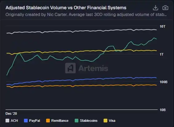 Compared to traditional payment systems, stablecoins have significantly faster circulation speeds. We have seen stablecoin supply continue to grow at a 30%-40% compound annual growth rate (CAGR), with transaction volumes increasing accordingly. Stablecoin transaction volume has already exceeded that of major credit card networks like Visa, currently processing around half of the Automated Clearing House (ACH) system's transaction volume. With the definition of the GENIUS Act finalized in early 2026, we may see stablecoins growing faster than their historical average growth rate as existing stablecoins continue to grow, and new entrants compete for this expanding market share.