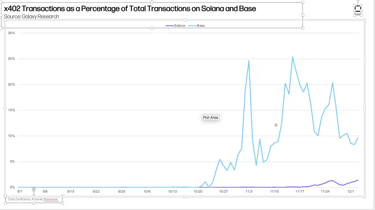 Payments based on the x402 standard will account for 30% of Base Chain's daily transaction volume and 5% of Solana's non-voting transaction volume, marking widespread adoption of on-chain proxy interactions.