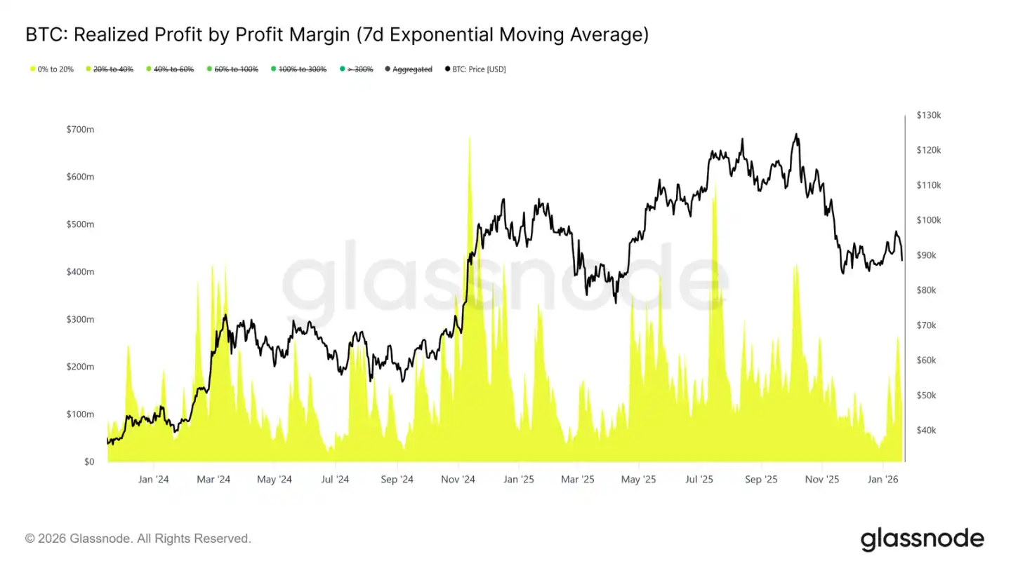 At the same time, realized profit data segmented by profit margin indicates a significant increase in profit-taking in the 0% to 20% profit margin range. This highlights the influence of "break-even sellers" and short-term swing traders, who tend to take small profits and exit rather than wait for the trend to continue.