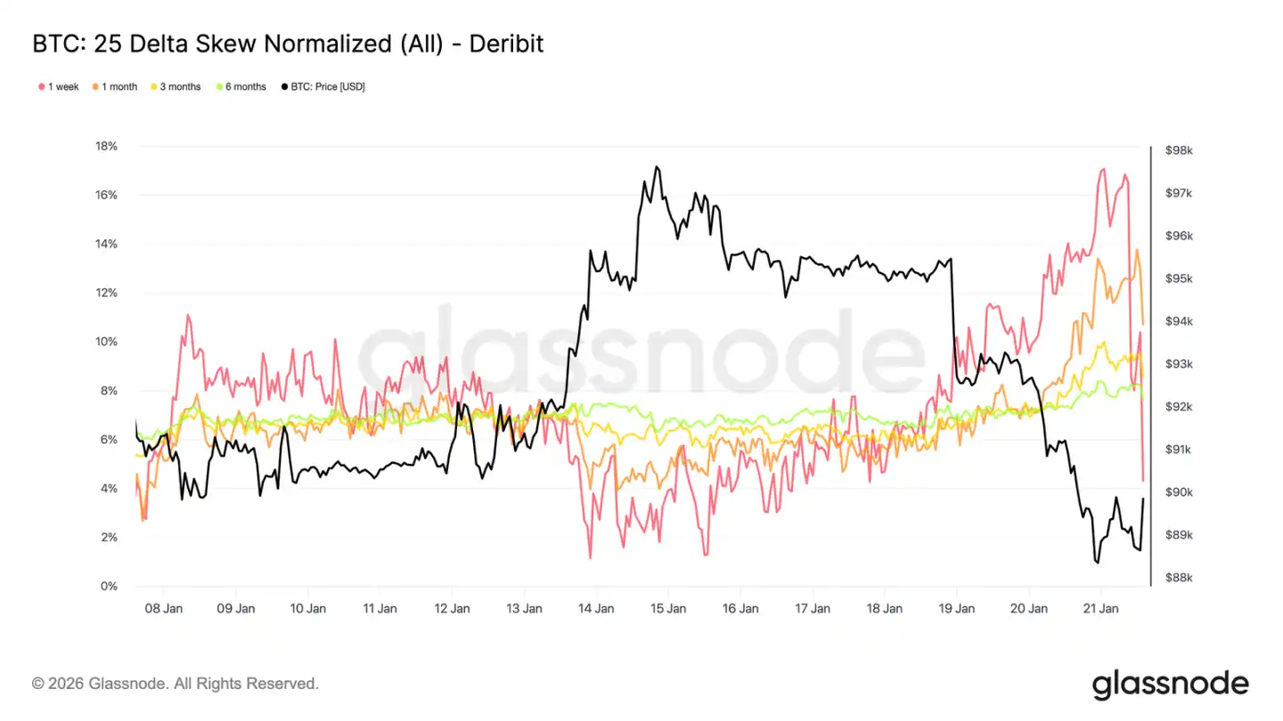 Such a pronounced skew tilt typically accompanies a localized extreme market condition, where positions are crowded, making it difficult to sustain the original trend. After the market had digested the impact of Davos Forum-related comments, some profit-taking on the downside premium occurred, and the skew swiftly started to pull back.