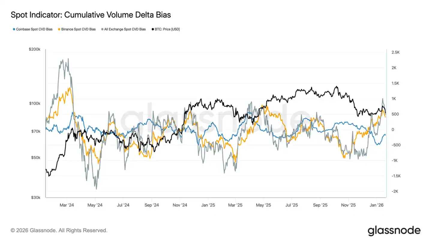 Spot market behavior has improved somewhat after the recent decline. Binance and exchange platform composite CVD (Cumulative Volume Diff) indicator has turned back to net buy status, indicating that spot participants are starting to reabsorb chips rather than sell on rallies, contrasting with the sustained selling pressure during the previous consolidation phase.
