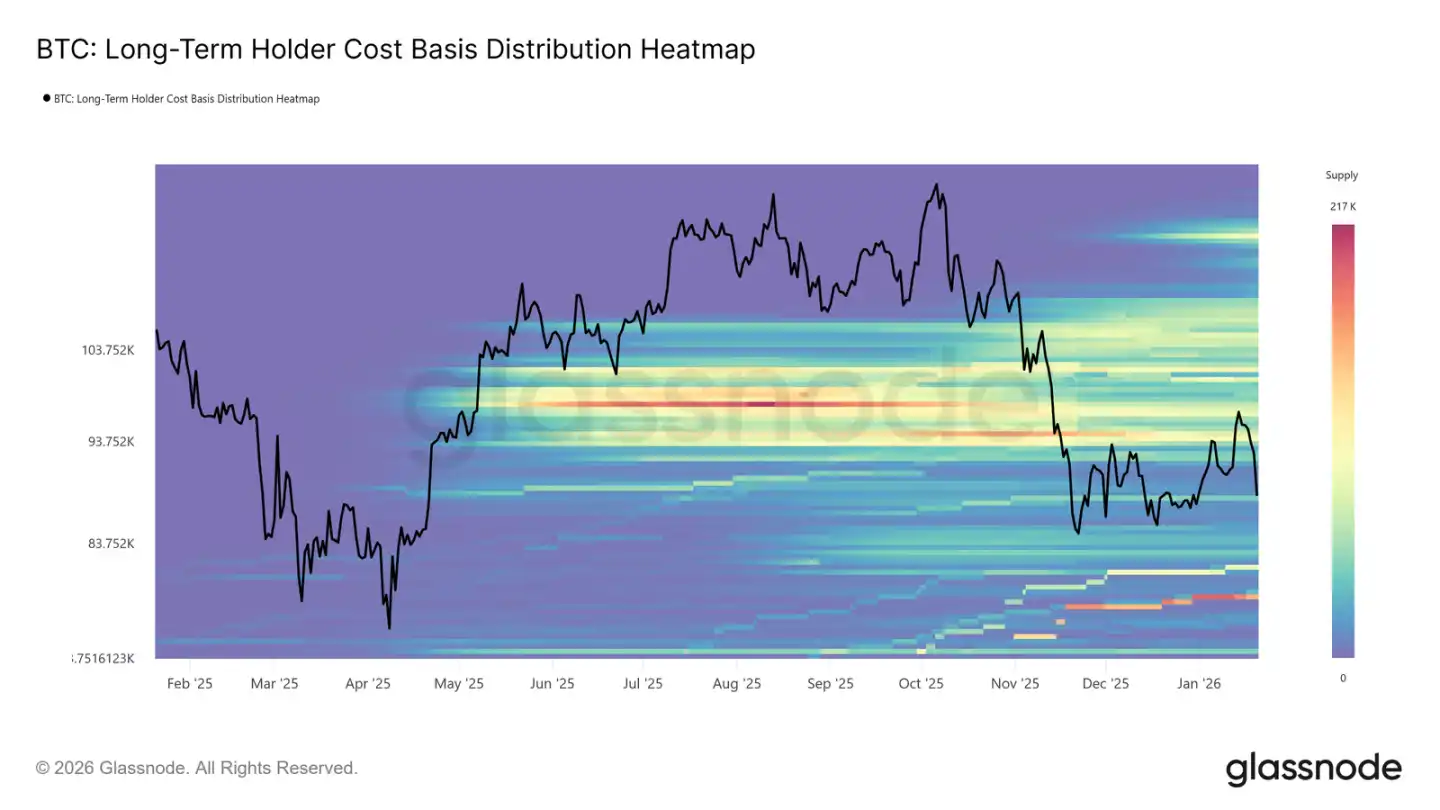 The long-term holder cost basis distribution heatmap shows a dense area of long-term coin holding costs above the current spot price. When the price rebounds to these historical buy-in levels, this area represents significant potential selling liquidity.