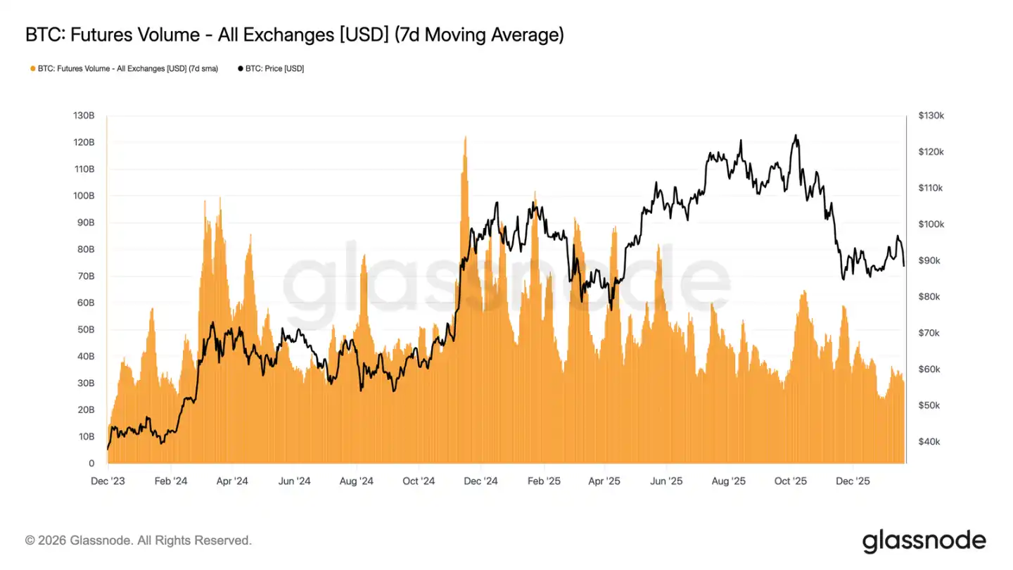 The 7-day moving average trading volume of Bitcoin futures continues to decline, far below the levels usually associated with a trending market. Recent price fluctuations have not been accompanied by effective volume amplification, highlighting the low participation and lack of confidence in the derivatives market.
