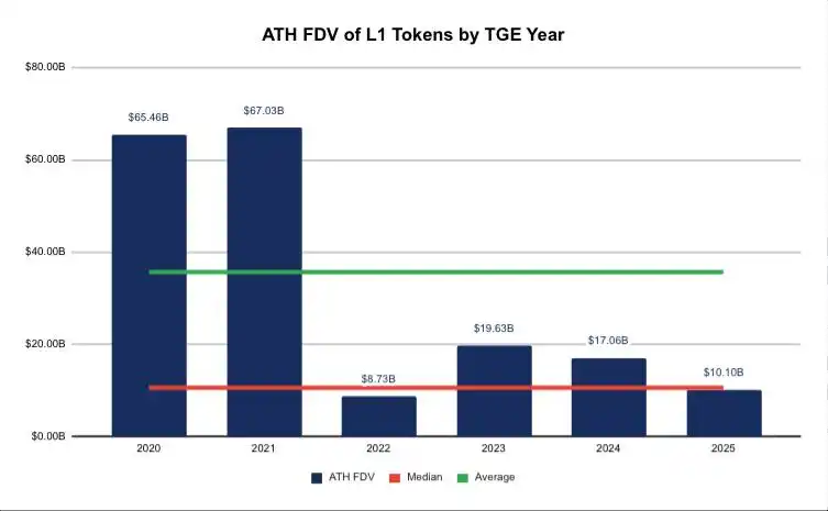 Layer1 token Historical All-Time High Fully Diluted Valuation (ATH FDV) per vintage TGE year statistics.