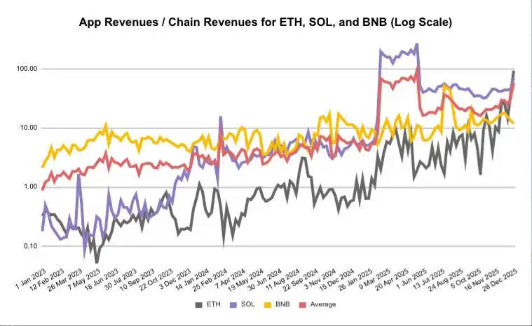 Comparison of Application Revenue / Chain Revenue for ETH, SOL, and BNB.