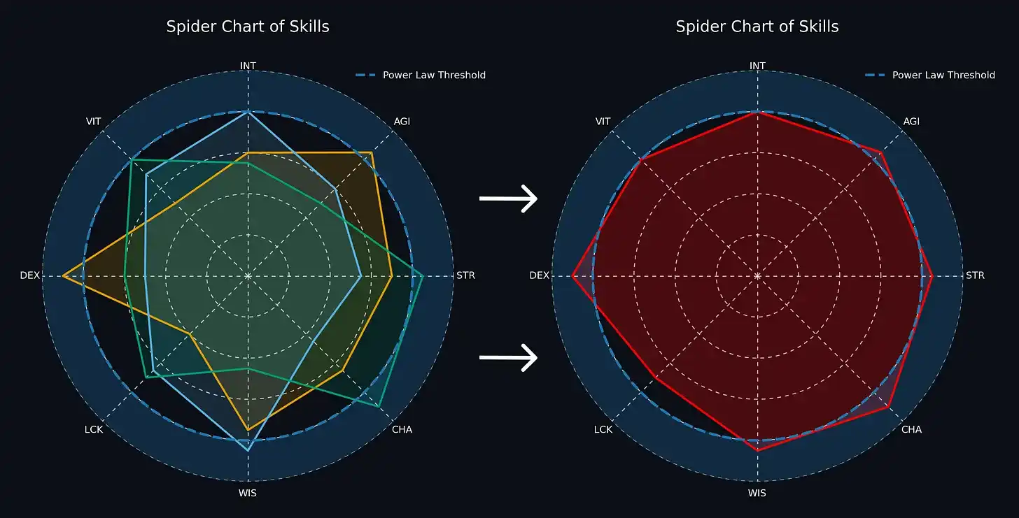 4) This game is winner-takes-all. If you want to continue making money, you need to fill in the attribute circles and cross the power law threshold.
