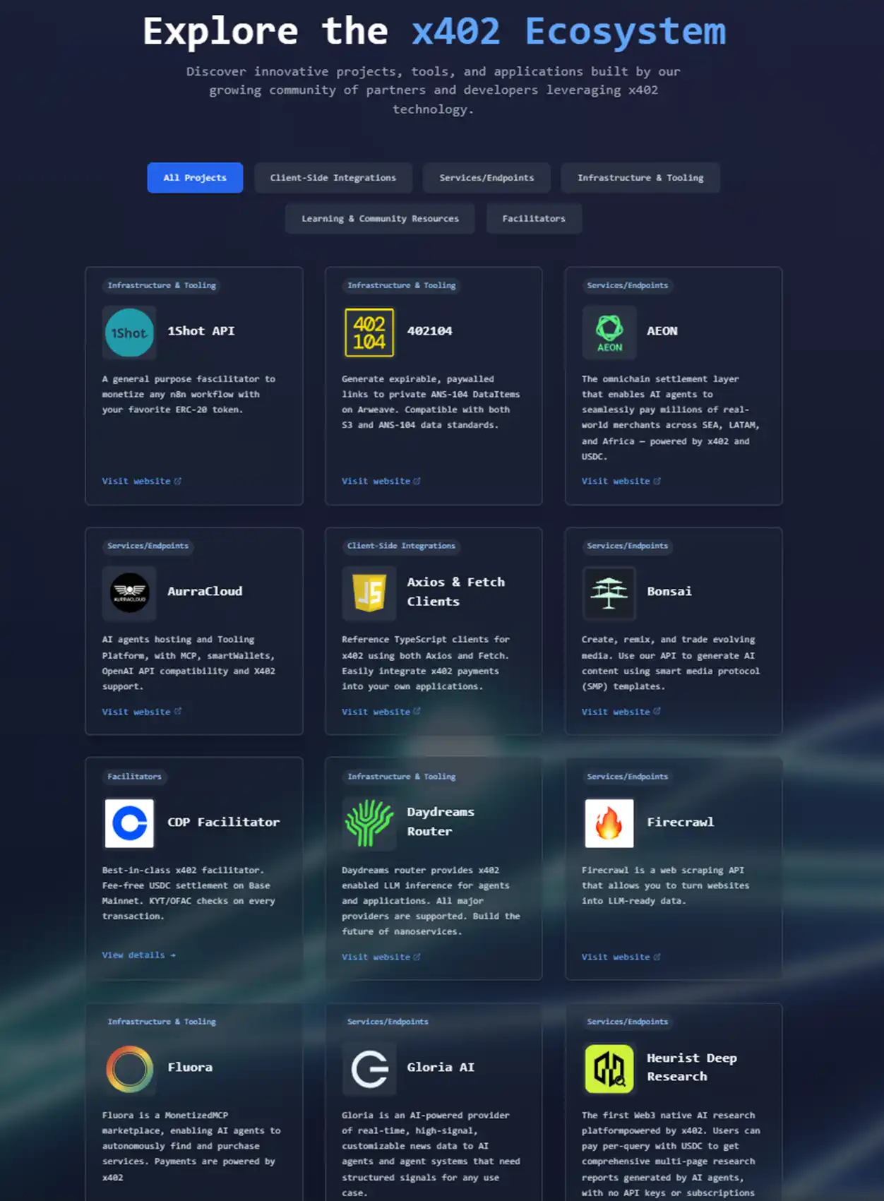 The Ecosystem page on the x402 protocol's official website provides a summary of current projects. By checking out each project individually, it feels like this protocol is still in a fairly early stage of development. Many projects either directly lead to technical documentation or jump to the projects' GitHub repositories.