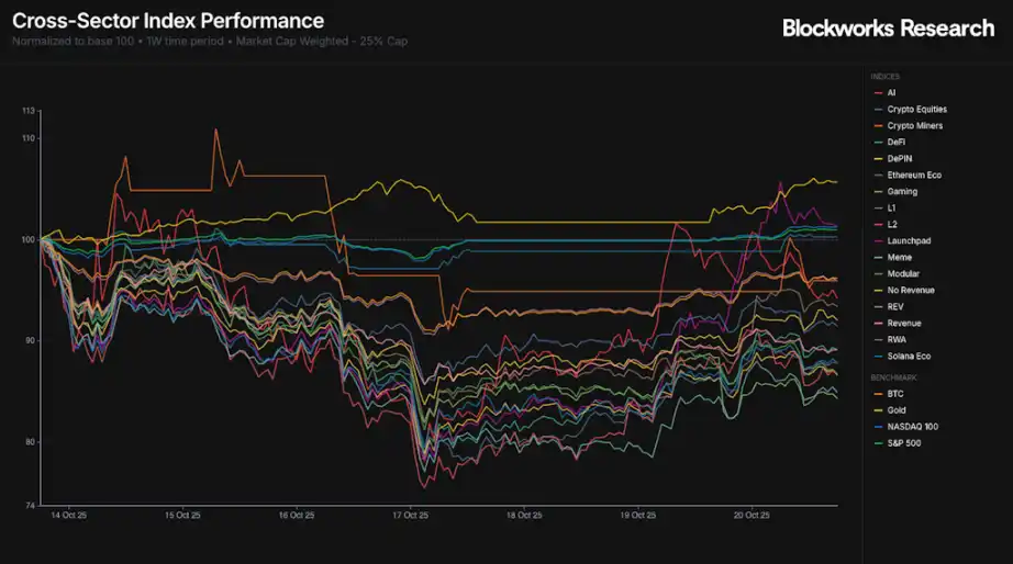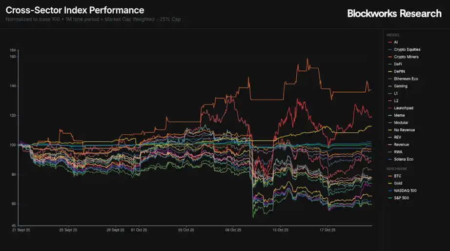 While there is some short-term upside, the monthly chart shows that almost all cryptocurrency indices have been falling over the past 30 days. The October 10 liquidation event resulted in widespread weakness, with only gold, cryptocurrency miners, AI, and stock indices performing strongly.