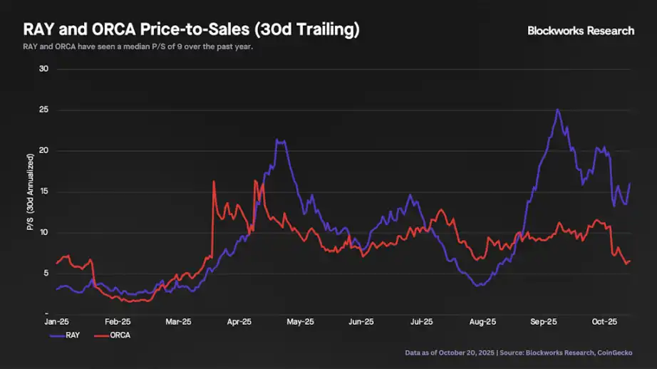 Regarding valuation, we can consider Raydium and Orca as comparable companies. The chart below shows the Price-to-Sales ratios of RAY and ORCA year-to-date based on 30-day annualized data. We observe that until September, the pricing ratios of these two assets were relatively similar, after which RAY began trading at a premium. Taking a broader view, the median Price-to-Sales ratio for these two assets in 2025 is 9x.