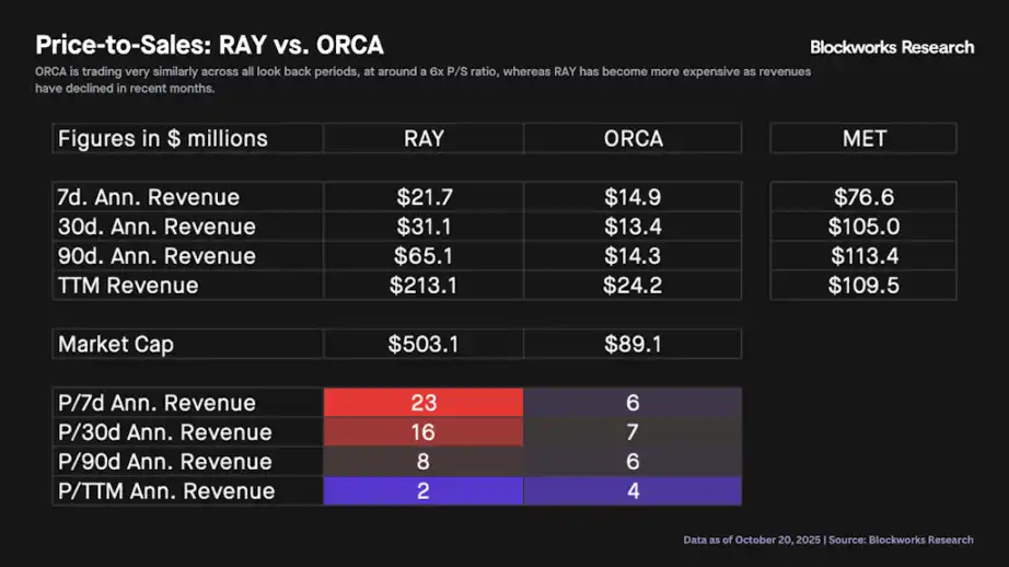 The table below compares the Price-to-Sales ratios of RAY and ORCA over various lookback periods. We notice that ORCA's trading behavior across all annualized time frames is very consistent, with a Price-to-Sales ratio of around 6x. On the other hand, as revenue declines, RAY has become more expensive over the past few months. For Meteora, we see its annualized revenue ranging from around $75 million to around $115 million based on the lookback period.