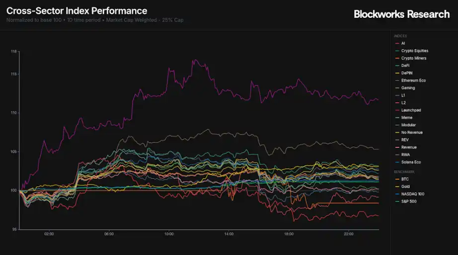The week started strong, with BTC rising 7% from last Friday's low. During Monday's trading session, the Launchpad sector performed the best, while the AI sector saw the biggest decline, reversing their relative strength and weakness shown over the past week.