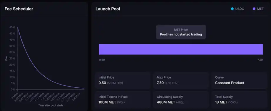 As mentioned earlier, 10% of the total supply will be used to seed initial liquidity through a dynamic AMM pool, with a starting price of $0.5 and liquidity distribution up to a $7.5 billion valuation. The early liquidity pool is one-sided, with early buyers exchanging their USDC for MET. It is important to note that the pool fees start high and sharply decrease over time through a fee schedule.