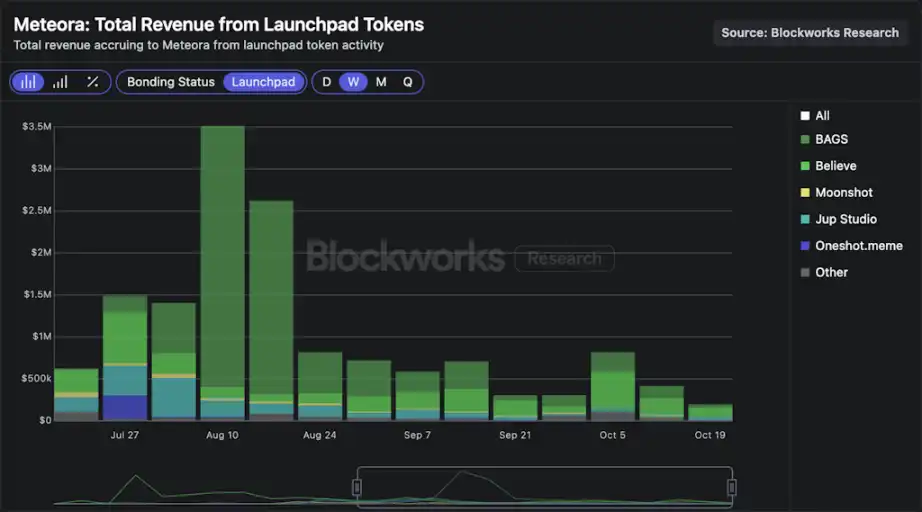 As mentioned earlier, this DEX collaborates closely with the Jupiter team, with Jupiter having become a popular gateway for retail users to conduct on-chain transactions. Additionally, in August 2024, Meteora partnered with Moonshot to launch a Launchpad and over time introduced new partners, including Believe, BAGS, and Jup Studio. The chart below shows that in recent weeks, Launchpad activities have contributed weekly revenues ranging from $200,000 to $800,000 to Meteora, with the majority of the traffic coming from Believe and BAGS.