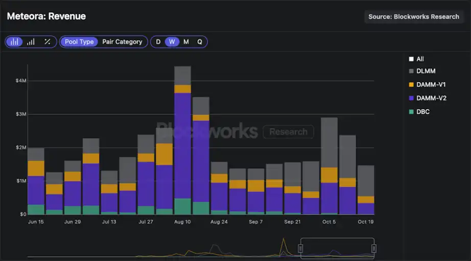 Looking at the overall financial data, Meteora generated $8.8 million in revenue over the past 30 days from all its liquidity pools, maintaining a weekly revenue close to $1.5 million even during periods of relatively low on-chain activity. It is noteworthy that over 90% of Meteora's revenue comes from Memecoin pools, which typically have higher fee levels compared to SOL-stablecoin, project token, LST, and stablecoin-stablecoin pools.