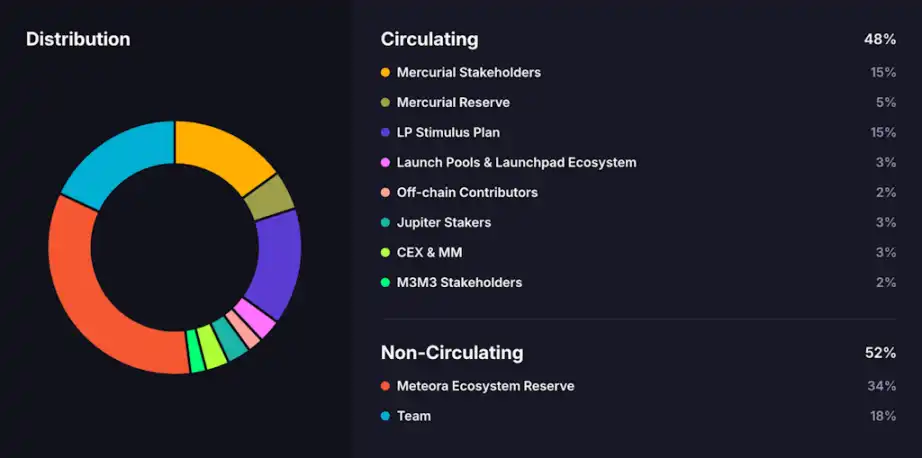 Back in 2023, the team announced that 20% of the MET tokens would be distributed to Mercurial stakeholders at the TGE. As shown below, the team has honored the initial commitment, with 15% allocated to Mercurial stakeholders and 5% allocated to the Mercurial reserve. Additionally, the DEX has been running a rewards program since January 31, 2024, distributing a total of 15% of MET to the program. At launch, 48% of the MET supply will be in circulation, which is a high circulating supply ratio compared to other prominent tokens in the Solana ecosystem.