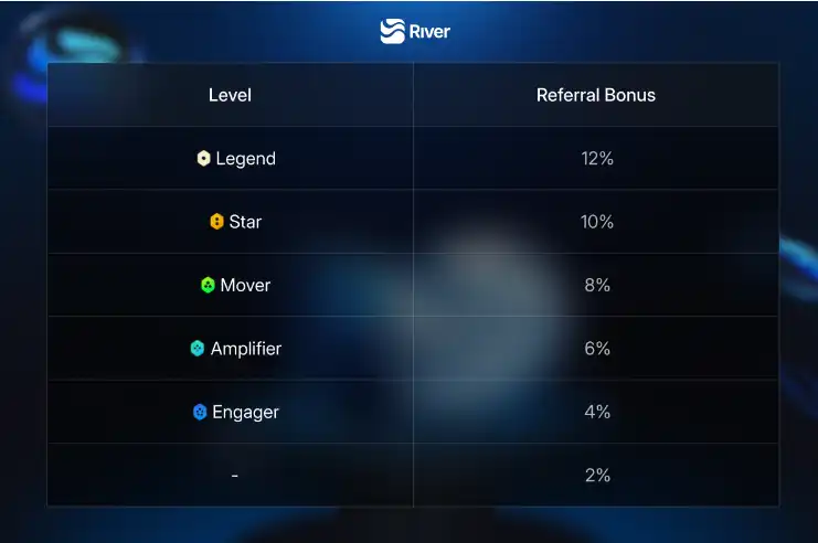 · Example: A Legend rank referrer (12% reward rate) invites others to buy 1 million River Pts and can receive 100,000 River Pts.