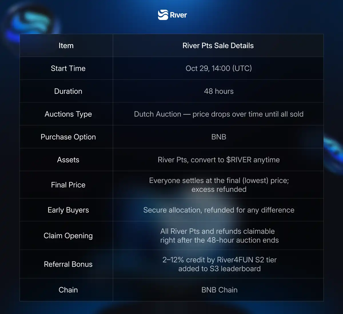 The River Pts sale adopts a Dutch auction mechanism, lasting 48 hours, with the price gradually decreasing until the full allocation is subscribed (allocation cap will be announced when live).