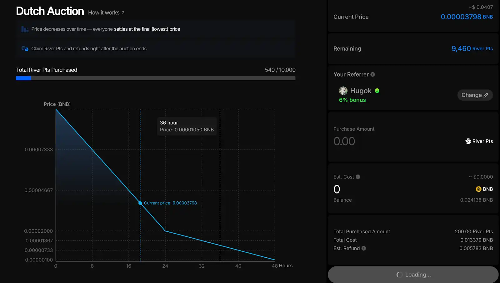 If a user purchases 100,000 River Pts for $1, and the final price is $0.5, the user can receive 100,000 River Pts after the auction ends, along with a refund of $50,000 BNB.