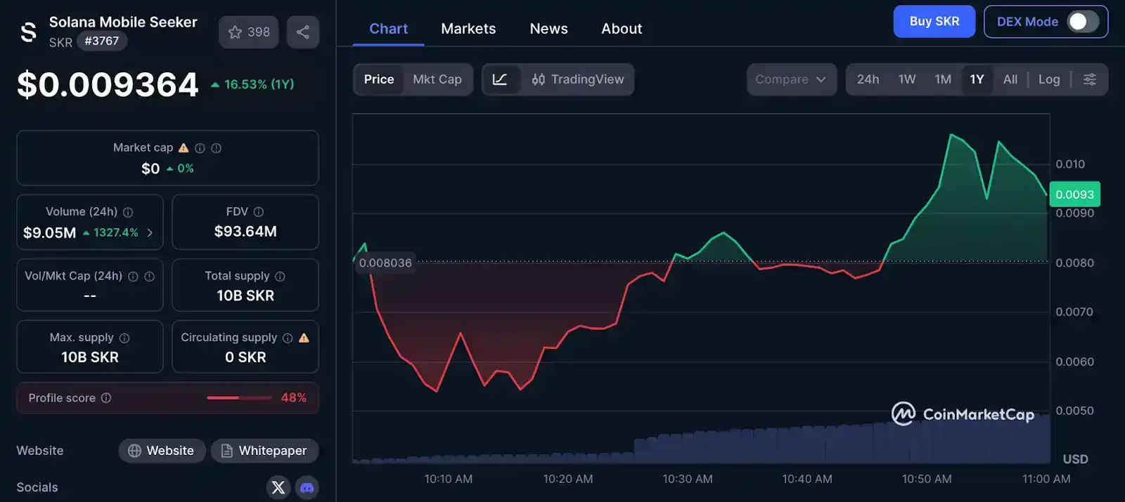 According to data, SKR fluctuated between $0.006 and $0.01 in the first hour of trading. Based on the current market price of around $0.0095 at the time of writing, the initial Scout tier holders received an airdrop value of $47.5; while the highest Sovereign tier holders received up to $7,125, a return of over 14 times compared to the initial Seeker phone's presale cost of about $450 to $500.