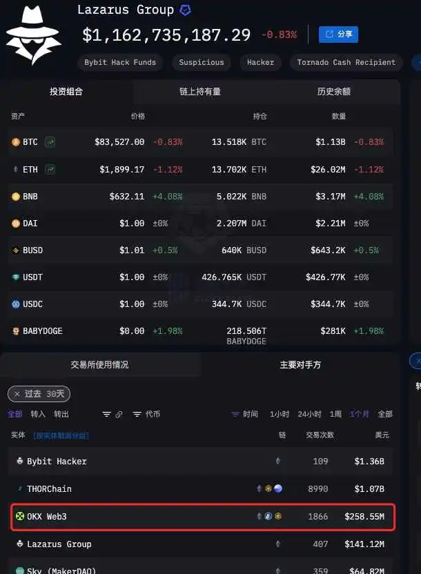 Furthermore, on Arkham, it can be seen that the Lazarus Group conducted $250 million in transactions using OKX DEX in the past month.