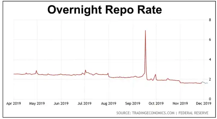 At that time, the Federal Reserve's target rate was 2.00-2.25%, and the repo rate jumped to five times the Fed's policy rate in a matter of hours, all because bank reserves had dropped too low.