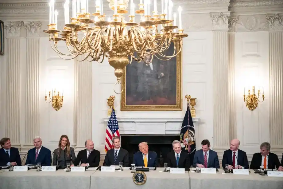 David Sacks sits to the right of President Trump, participating in the March White House digital assets summit. Since mid-2024, Trump has appeared on the "All-In" podcast three times. Photo Credit: Haiyun Jiang for The New York Times