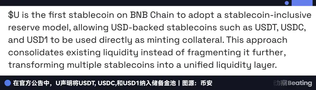 The design logic of U is radically different from the former two: it does not compete directly with USDT, USDC, or USD1, but rather incorporates them all into its reserve pool. In a sense, U is a "stablecoin of stablecoins," or a "stablecoin ETF."
