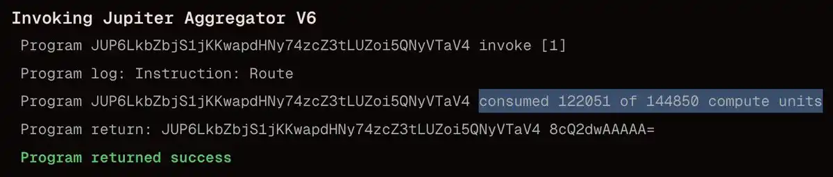 Jupiter Swap: A swap through the Jupiter route can reach ~100,000 CU, with a total cost of 0.000005 SOL